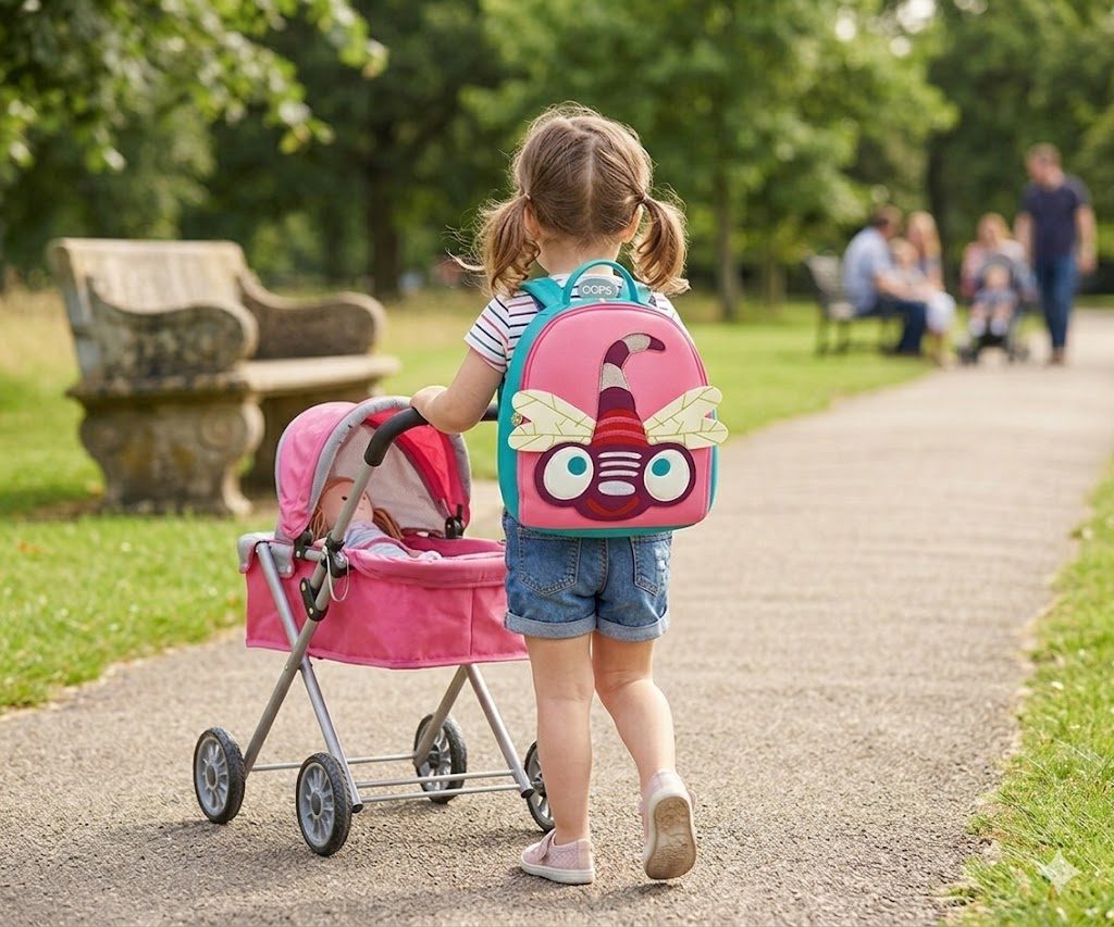 Menší, barevný batoh z polyesteru, motiv vážka, s rukojetí a nastavitelnými ramenními popruhy, velikost cca 10x19x24 cm. Pro děti starší 18 měsíců. Pozor: Délka popruhu by měla být nastavena dospělými.