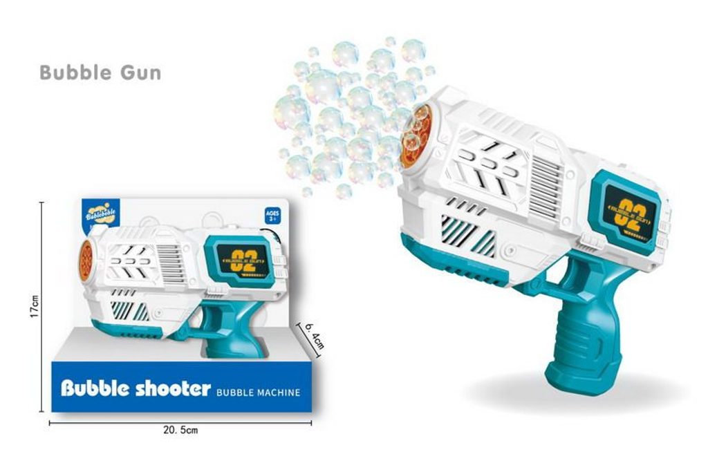 Bublifuk pistole. Rozměry pistole 19,5x14,7x5,8 cm. Nádržka o objemu 50 ml.