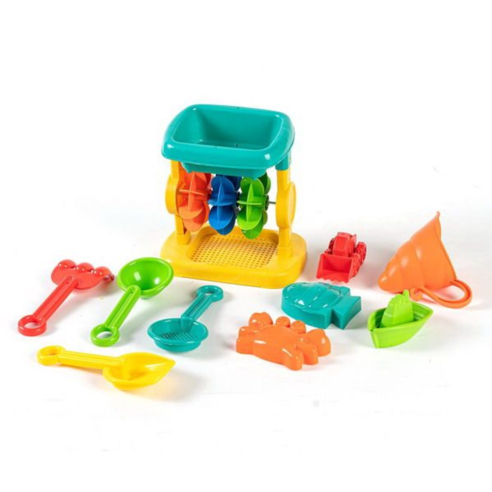 Sada na písek mlýnek 10 ks. Rozměry 17x11x23 cm. Součástí mlýnek, 2 lopatky, hrabičky, sítko, formičky.