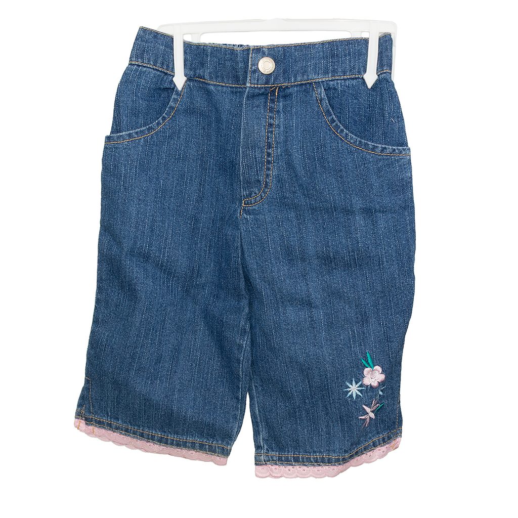 Kvetinová aplikácia na jednej nohavici dodáva roztomilý vzhľad