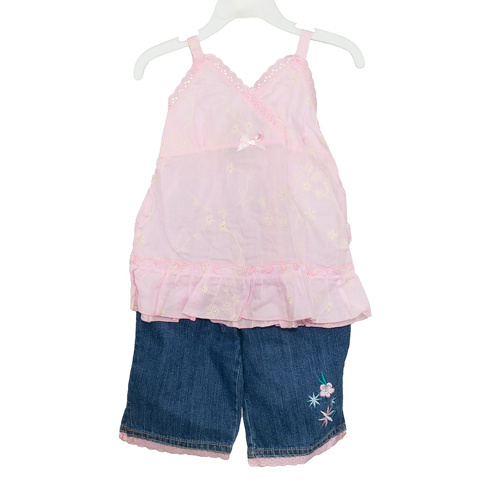 Roztomilá a pohodlná súprava pre malé dievčatká! Táto dievčenská súprava od značky Pidilidi obsahuje ružové tielko na ramienka a štýlové džínsové nohavice. Tielko je vyrobené z príjemného materiálu, ideálneho na teplejšie dni. Nohavice majú elastický pás na jednoduché obliekanie a maximálne pohodlie, dve predné vrecká a krásne detaily - ružovú čipku na konci nohavíc a vyšívanú kvetinovú aplikáciu na jednej nohavici. Skvelé oblečenie na každodenné nosenie aj slávnostné príležitosti!