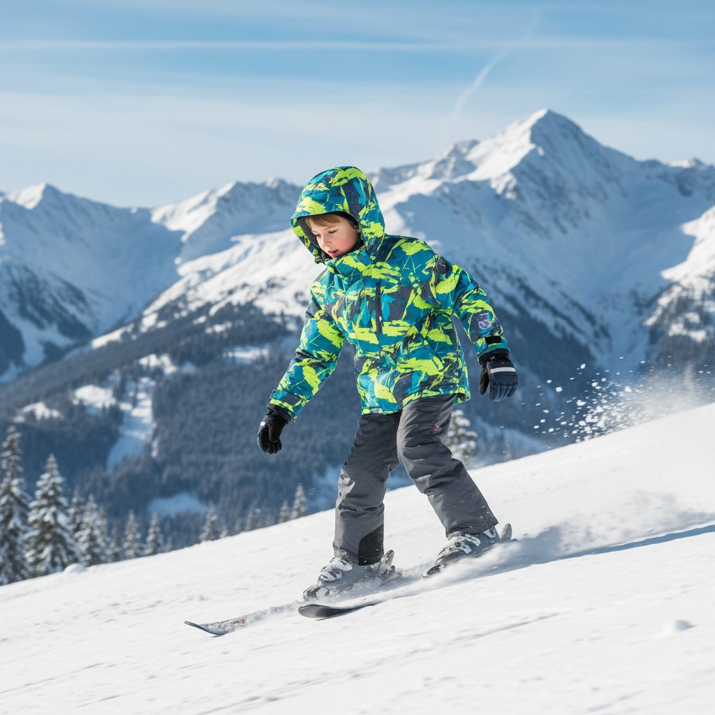 Detská lyžiarska bunda v modernej farebnej kombinácii. Bunda s vnútorným lyžiarskym pásom a skipasom - vrecko na ľavom rukáve. Má hrejivú výplň, efektnú hladkú flísovú podšívku (vpredu a vzadu, kapucňa), má pevnú kapucňu. Zapínanie na zips po celej dĺžke na prednej strane s ochranou brady, zips je chránený légou na suchý zips. Bunda má dve bočné vrecká na zips. Rukávy sú ukončené sťahovacou šnúrkou na suchý zips (možno upraviť podľa potreby), vnútri rukáva elastický úplet s otvorom na palec. Predĺžený zadný diel. Reflexná potlač na prednej a zadnej strane.